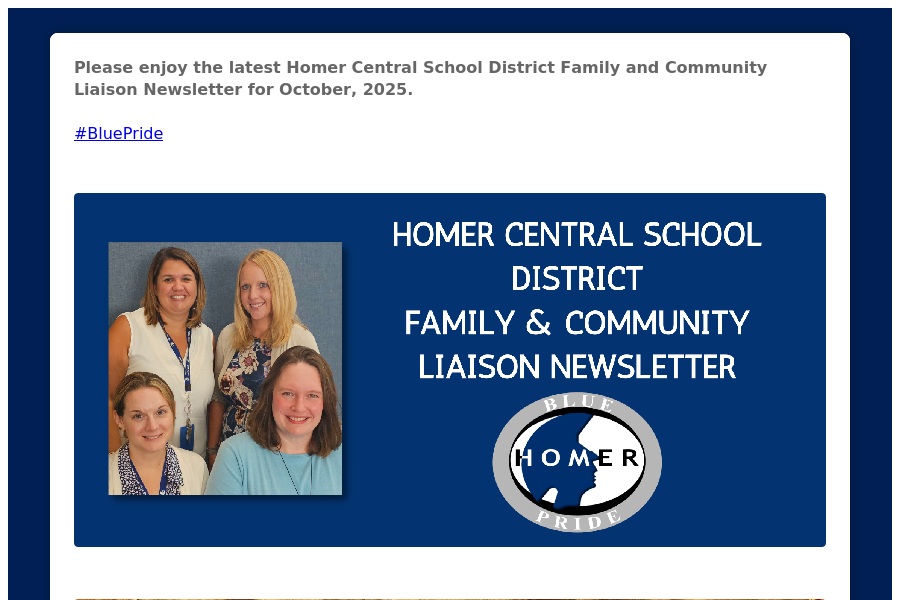 Please enjoy the latest Homer Central School District Family and Community Liaison Newsletter for October, 2025. #BluePride NAMI Ending t. . .